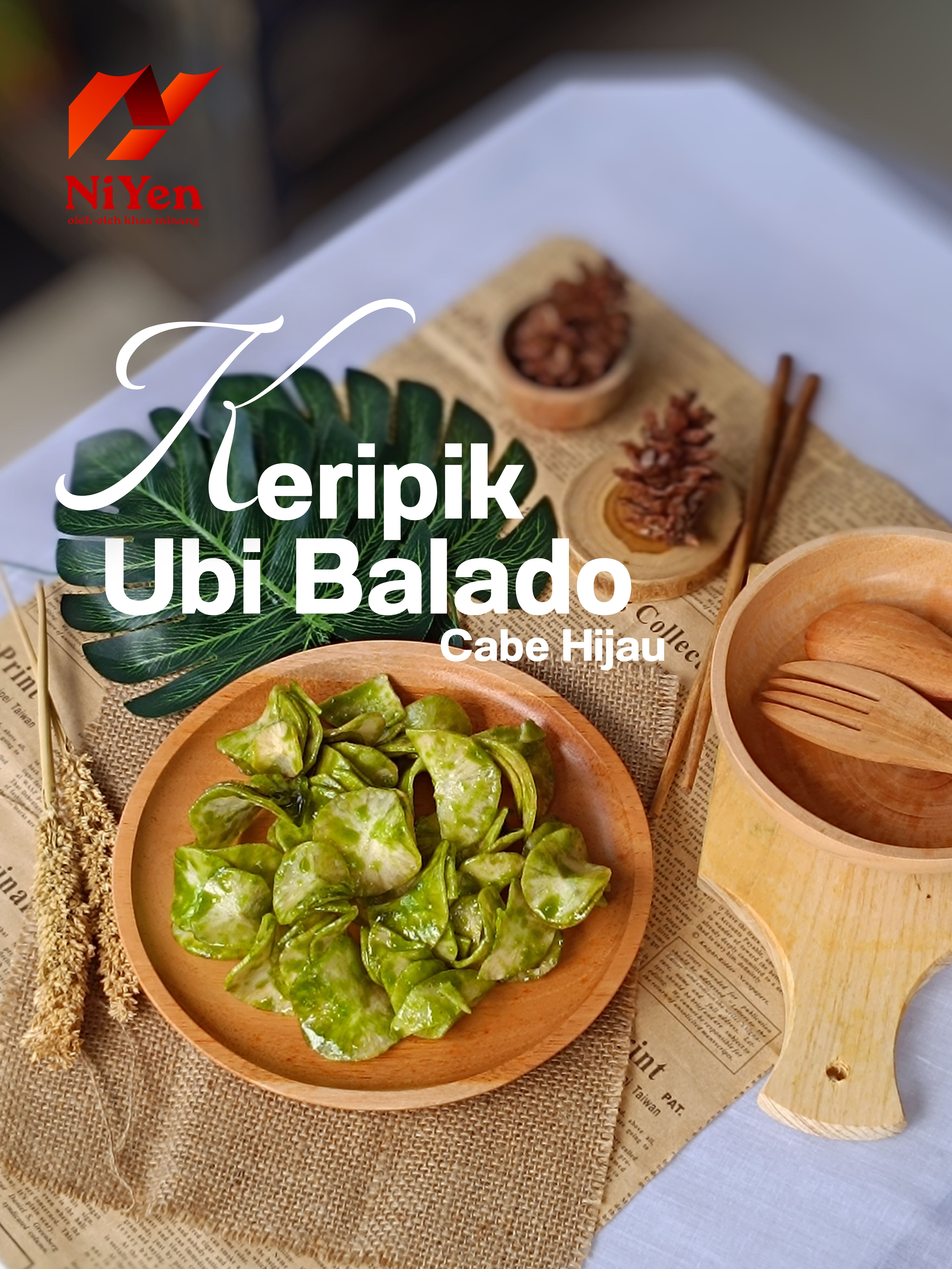 Keripik ubi balado cabe hijau adalah camilan renyah dari irisan ubi (singkong) yang digoreng garing lalu dibumbui saus balado pedas gurih, di mana warna hijaunya berasal dari penggunaan cabai hijau sebagai bahan utama bumbu. Camilan ini memiliki perpaduan rasa pedas, gurih, dan manis khas balado, serta tekstur yang renyah dan menggugah selera, menjadikannya camilan populer bagi pecinta makanan pedas.